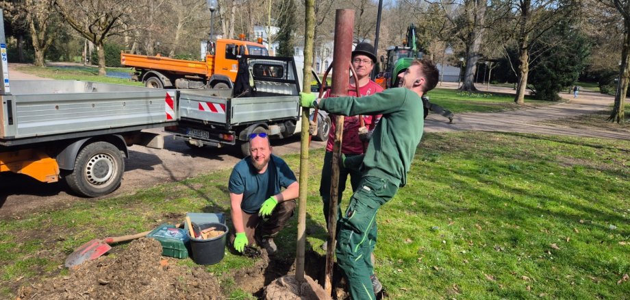 Foto: Die städtischen Gärtner Sebastian Geiß, Markus Weiß und Joshua Sträßner pflanzen einen Ahorn im Alten Kurpark, im Bereich Eingang Uhrentürmchen.