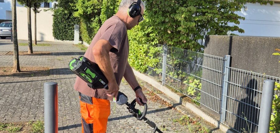 Mit Akkuhandsense, Besen und Laubbläser befreien sie Plätze, Treppen und Parkbuchten von Unkraut, Schmutz und Laub. „Das sieht auch alles leichter aus als es ist“, stellt Barbara Hermanowski von der städtischen Abteilung Kommunikation und Marketing fest, die die beiden Kollegen bei ihrer Arbeit begleitet und auch selbst mit angepackt hat. „Das Handling mit der Akkuhandsense will geübt sein – und das Gerät ist auf die Dauer auch ganz schön schwer.“ Und auch bei Sommertemperaturen besteht die Schutzkleidung stets aus langer Arbeitshose, festen Schuhen, Schutzbrille und Gehörschutz.
