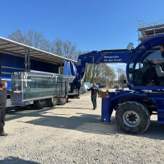 Höchste Präzision erforderlich Die Anlieferung und das Handling dieser Bauteile erforderten höchste Präzision. Jedes Element wurde sorgfältig vom LKW entladen und behutsam an seinen Bestimmungsort gebracht, um Beschädigungen zu vermeiden. Im ersten Schritt montierten die Fachkräfte die Bodenschienen sowie die Seiten- und Laufschienen. Diese wurden exakt ausgerichtet und dauerhaft befestigt. Anschließend konnten die gläsernen Torelemente eingehängt werden, die über speziell konstruierte Scharniere miteinander verbunden sind. |