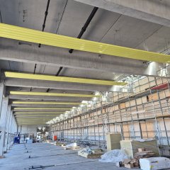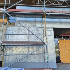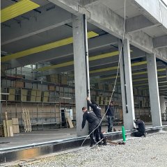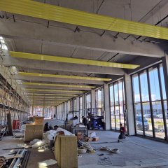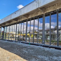 Glastore sind verbaut! Am 25. März 2026 war es dann so weit: Das erste Tor wurde erfolgreich fertiggestellt. Nur zwei Tage später war bereits die gesamte Torfront zur Königsteiner Straße geschlossen – ein Meilenstein, der die Dimension und Funktionalität der künftigen Fahrzeughalle nun eindrucksvoll erkennen lässt. Nach der mechanischen Montage aller Toranlagen folgen in den nächsten Schritten die elektrotechnischen Arbeiten. Dazu gehören die vollständige Verkabelung sowie die Anbindung an die Steuerungstechnik. Abschließend werden alle Anlagen umfassend geprüft, damit ein sicherer und reibungsloser Betrieb gewährleistet ist. Feuerverzinkte Metallfassade Auch an anderer Stelle schreiten die Arbeiten kontinuierlich voran. Seit Ende Januar wird die vorgehängte, feuerverzinkte Metallfassade umgesetzt. Zunächst wurde am Wohnhaus die Unterkonstruktion montiert und die Wärmedämmung angebracht. Parallel dazu haben an der Feuerwache die Arbeiten an der Sockeldämmung begonnen. Innenausbau läuft planmäßig Im Innenbereich entwickelt sich der Ausbau planmäßig weiter. Nachdem die technischen Gewerke ihre Leitungen in die Trockenbauwände eingebracht hatten, wurden im Erdgeschoss die Wände geschlossen und beidseitig beplankt. Durch das anschließende Spachteln entstanden gleichmäßige Oberflächen, die nun bereit für die Folgearbeiten sind. |