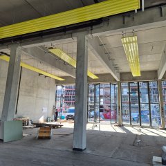 Ein weiterer wichtiger Bauabschnitt hat ebenfalls begonnen: die Estricharbeiten im Erdgeschoss. Zunächst wurde die Dämmschicht verlegt, darauf aufbauend der Estrich eingebracht. Dieser bildet die Grundlage für die späteren Bodenbeläge – je nach Nutzung der Räume sind Fliesen oder Industrieparkett vorgesehen. Nach Abschluss im Erdgeschoss werden die Ausbauarbeiten Schritt für Schritt in die oberen Geschosse verlagert. Heizung, Lüftung, Sanitär: Es geht voran! Die technischen Gewerke sind ebenfalls weit fortgeschritten. Die Rohinstallationen für Heizung, Lüftung und Sanitär sind größtenteils abgeschlossen. Lüftungskanäle, Trinkwasserleitungen sowie Heizungsanlagen sind weitgehend installiert. In den kommenden Wochen werden die Arbeiten in den Technikzentralen weiter intensiviert. Auch die elektrotechnischen Rohinstallationen im Erdgeschoss und im ersten Obergeschoss sind bis auf in der Fahrzeughalle abgeschlossen und für die Estricharbeiten vorbereitet. Im zweiten Obergeschoss werden diese Arbeiten nun fortgesetzt. Arbeiten am Wohnhaus Parallel dazu laufen die Arbeiten am Wohnhaus weiter. Während im Erdgeschoss die Trockenbauarbeiten bereits abgeschlossen sind, werden in den oberen Geschossen derzeit noch die Rohinstallationen fertiggestellt. Im Anschluss können dort die Wände geschlossen und die Oberflächen bearbeitet werden. |