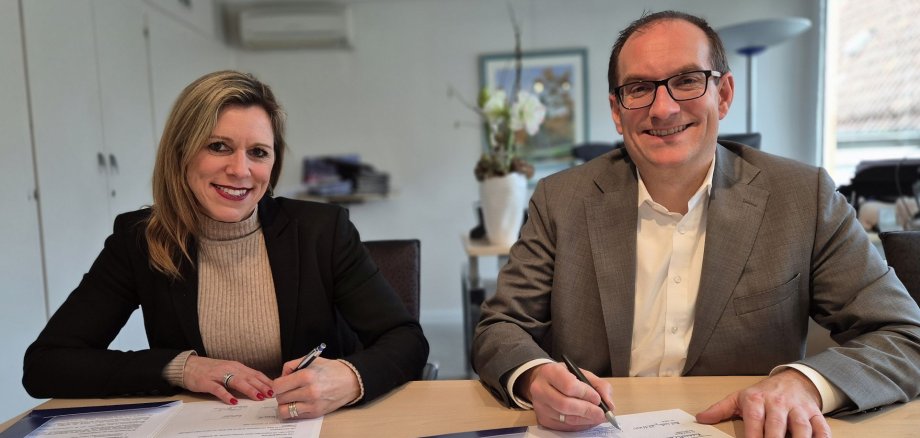 Amtliche Bekanntmachungen werden auf der Homepage der Stadt bekanntgemacht. Den Hinweis zu den jeweiligen Bekanntmachungen veröffentlicht die Stadt laut Hauptsatzung in einer örtlichen Zeitung. Im Zuge der Ausschreibung für das Jahr 2026 hat die Bad Sodener Zeitung den Zuschlag erhalten und wird damit auch im nächsten Jahr die städtischen Hinweisbekanntmachungen veröffentlichen. Inken Hegner, Geschäftsführerin der Bad Sodener Zeitung, und Bürgermeister Dr. Frank Blasch bei der Vetragsunterzeichnung über die Veröffentlichungen der Hinweisbekanntmachungen der Stadt. |