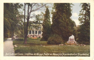 Foto links: Das Ehrenmal an seinem ehemaligen Standort im Alten Kurpark um 1930. Quelle: Stadtarchiv Stadt Bad Soden am Taunus