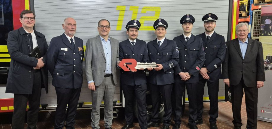 Im Rahmen der Jahreshauptversammlung wurde jetzt das neue Löschgruppenfahrzeug LF 10 offiziell an die Freiwillige Feuerwehr Bad Soden-Neuenhain übergeben. Dieses hochmoderne Fahrzeug stärkt nachhaltig die Einsatzfähigkeit der Einsatzkräfte in der Brandbekämpfung sowie bei kleineren technischen Hilfeleistungen. Im Rahmen der Fahrzeugübergabe wurden die Neuenhainer Feuerwehrleute von Pfarrer Stefan Rexroth gesegnet. Die symbolische Schlüsselübergabe an die amtierende Wehrführung, Tizian Collischonn und Maximilian Schichtel und ihren Vorgänger, Maximilian Berny, übernahmen Bürgermeister Dr. Frank Blasch und die Stadtbrandinspektoren Thomas Velten und Patrick Ritter. Feuerwehrtechnik des 21. Jahrhunderts Das neue LF 10 bietet Platz für eine Löschgruppe (neun Einsatzkräfte). Zur Ausstattung zählen unter anderem ein 1.200-Liter-Löschwassertank, eine Feuerlöschkreiselpumpe mit einer Pumpenleistung von bis zu 2.000 Litern pro Minute, ein fest installierter LED-Lichtmast und ein tragbarer Generator. Eine Besonderheit ist das elektrische Öffnungssystem der Geräteräume, das eine schnelle Übersicht und eine einfache Geräteentnahme ermöglicht. Auch die neue Leiterentnahmehilfe erleichtert den Einsatzkräften die Arbeit: Die auf dem Fahrzeugdach verlastete, vierteilige Steckleiter kann nun vom Boden aus über einen absenkbaren Schlitten entnommen werden. Mit der Indienststellung endet zugleich die langjährige Dienstzeit des bisherigen LF 8/6, das seit 1996 zuverlässig Ausbildung, Übungen und Einsätze geprägt hatte. Ein schöner Tag für alle Beteiligten In seiner Ansprache hob Bürgermeister Dr. Frank Blasch hervor, wie viele verschiedene Akteure an der Fahrzeugbeschaffung beteiligt waren, von der Stadtverwaltung über die Stadtverordnetenversammlung und den Magistrat bis hin zum Neuenhainer Fahrzeugbeschaffungsausschuss und den Wehrführern der vergangenen drei Jahre. „Heute ist ein schöner Tag für die Feuerwehr Neuenhain und für die Bürgerinnen und Bürger unserer Stadt – für uns alle!“, fasste der Bürgermeister zusammen. Foto: Von links nach rechts: Pfarrer Stefan Rexroth, Stellv. Stadtbrandinspektor Thomas Velten, Bürgermeister Dr. Frank Blasch, Stellv. Stadtbrandinspektor Patrick Ritter, die Neuenhainer Wehrführer Tizian Collischonn und Maximilian Schichtel, ihr Vorgänger Maximilian Berny, Stadtverordnetenvorsteher Helmut Witt. |