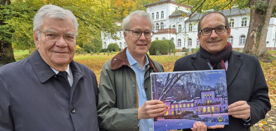 Foto: Stadtverordnetenvorsteher Helmut Witt (links) und Bürgermeister Dr. Frank Blasch (rechts) nehmen den Adventskalender von Dr. Eckhard Wendt (Präsident des Lions Club Bad Soden-Vortaunus) entgegen.