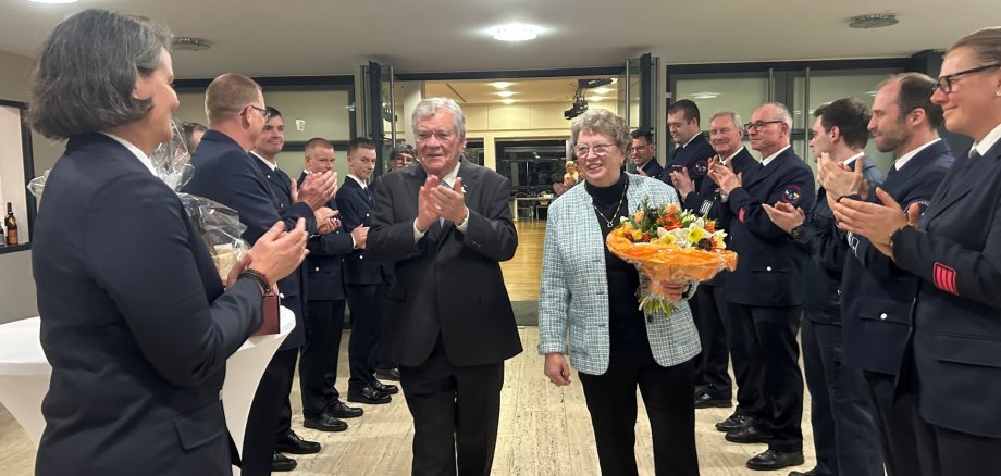 Helmut Witt und Ehefrau Eveline beim Auszug aus dem Sitzungssaal mit den Kameradinnen und Kameraden der Feuerwehren. Foto: Stadt Bad Soden am Taunus