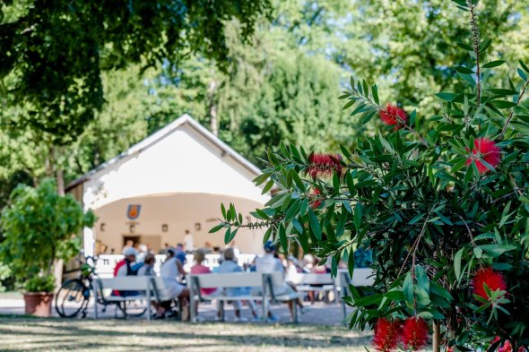 Was haben Bata Illic, Peggy March und Stefanie Hertel gemeinsam? Richtig: Sie standen auf der Bühne in der Konzertmuschel und haben ein dankbares Publikum mit ihren Liedern begeistert. Wer sich dem Badehaus nähert, dem fällt die Konstruktion an seinem schattigen Platz gleich ins Auge. Sie wurde in den 1930er Jahren erbaut und erinnert Betrachter an die Bad Sodener Geschichte des Kurbetriebs, bei dem die sonntäglichen Kurkonzerte nicht fehlen durften. In den Sommermonaten von Mai bis September hat sich diese Tradition mit den wöchentlichen und gut besuchten Sonntagskonzerten erhalten. Außer Schlagergrößen treten dabei Bands ganz unterschiedlicher Stilrichtungen auf: von der Blasmusik über Shantys bis hin zu Operettenklängen. Die Konzertmuschel hat viele und ganz unterschiedliche Formate erlebt. Auch Gottesdienste wurden in ihr zelebriert und Spiele der Fußballweltmeisterschaft live übertragen. Bei den Konzerten der Sommer lounge stehen Pop- und Rockbands auf ihrer Bühne.