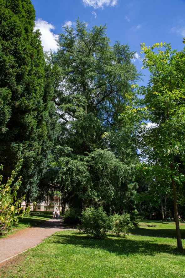 Er ist nicht nur einer der markantesten Bäume im Alten Kurpark, sondern auch einer der höchsten seiner Art in Hessen: der Ginkgo, lateinisch Ginkgo biloba. Er steht fast unübersehbar an der Wegegabelung rechts von der Konzertmuschel. Diese Baumgattung existiert seit der Jurazeit vor 180 Millionen Jahren. Der Ginkgo stammt aus Ostasien. Das Besondere an dem Baum: Er gehört weder zu den Nadel- noch zu den Laubbäumen, sondern bildet eine eigene Gruppe. In China und Japan wird der Ginkgobaum schon seit Jahrhunderten als kraftspendend und lebensverlängernd verehrt. Auch in der traditionellen chinesischen Medizin haben Samen, Wurzel und Blätter des Ginkgobaums ihren festen Platz.