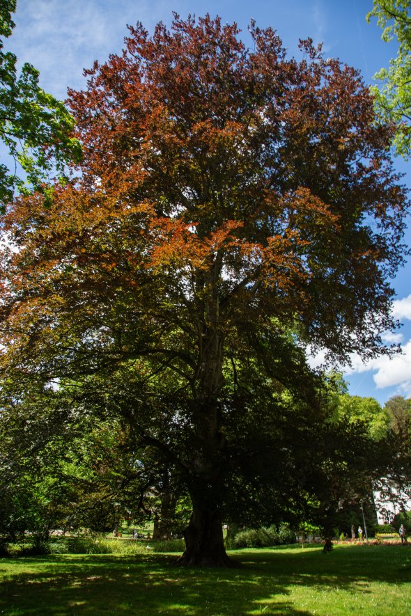Besucher des Alten Kurparks staunen, welch ein prächtiges Exemplar eines Laubbaums auf der Wiese vor dem Kulturzentrum Badehaus steht. Fast drei Personen braucht es, um den fünf Meter dicken Stamm des Riesen am Fußende ganz zu umfassen. Mit seinen tausenden Blättern filtert er die Luft und spendet große Mengen an Sauerstoff. Der beeindruckende Baum der Gattung Fagus sylvatica atropunicea gehört zu den ältesten Bäumen in der Parkanlage. Die Blutbuche wird wegen der Färbung ihrer Blätter auch Purpurbuche genannt. Sie ist eine Mutation der weit verbreiteten Rotbuche. Grund für die Tönung der Blätter ist die Abwesenheit von Enzymen.