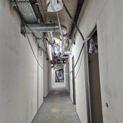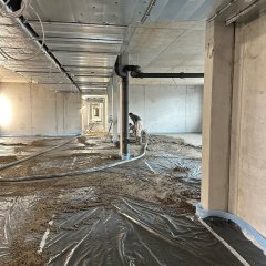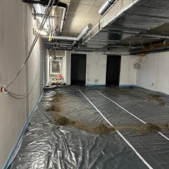 Ein weiterer wichtiger Bauabschnitt hat ebenfalls begonnen: die Estricharbeiten im Erdgeschoss. Zunächst wurde die Dämmschicht verlegt, darauf aufbauend der Estrich eingebracht. Dieser bildet die Grundlage für die späteren Bodenbeläge – je nach Nutzung der Räume sind Fliesen oder Industrieparkett vorgesehen. Nach Abschluss im Erdgeschoss werden die Ausbauarbeiten Schritt für Schritt in die oberen Geschosse verlagert. Heizung, Lüftung, Sanitär: Es geht voran! Die technischen Gewerke sind ebenfalls weit fortgeschritten. Die Rohinstallationen für Heizung, Lüftung und Sanitär sind größtenteils abgeschlossen. Lüftungskanäle, Trinkwasserleitungen sowie Heizungsanlagen sind weitgehend installiert. In den kommenden Wochen werden die Arbeiten in den Technikzentralen weiter intensiviert. Auch die elektrotechnischen Rohinstallationen im Erdgeschoss und im ersten Obergeschoss sind bis auf in der Fahrzeughalle abgeschlossen und für die Estricharbeiten vorbereitet. Im zweiten Obergeschoss werden diese Arbeiten nun fortgesetzt. Arbeiten am Wohnhaus Parallel dazu laufen die Arbeiten am Wohnhaus weiter. Während im Erdgeschoss die Trockenbauarbeiten bereits abgeschlossen sind, werden in den oberen Geschossen derzeit noch die Rohinstallationen fertiggestellt. Im Anschluss können dort die Wände geschlossen und die Oberflächen bearbeitet werden. |