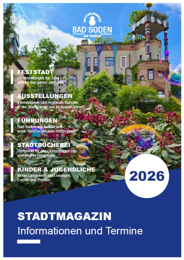 Mit seinen 23.200 Einwohnern, im Herzen der Metropolregion Frankfurt/RheinMain und am Fuße des Taunus gelegen, ist Bad Soden am Taunus eine liebens- und lebenswerte Stadt. Mit unserem Stadtmagazin wollen wir Einwohner, Neubürger und Gäste gleichermaßen über die Vorzüge unserer Stadt informieren, die mit einer lebendigen Kunst- und Kulturszene, über 110 Vereinen und einer spannenden Historie überzeugt. Neubürger erhalten die Broschüre direkt bei der Anmeldung im Bürgerbüro der Stadt in Bad Soden am Taunus. Exemplare liegen zudem in allen Verwaltungsstellen aus.